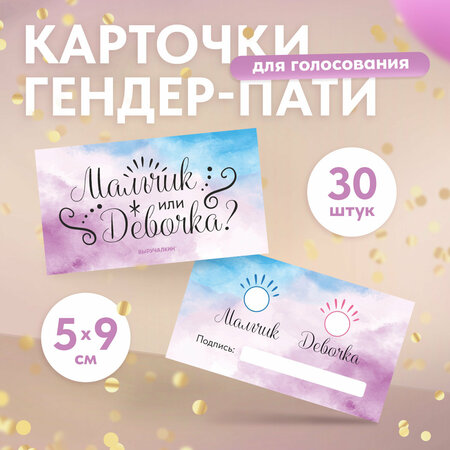 Набор из 30 карточек для голосования за пол ребёнка на гендер пати. Размер каждой карточки 9х5 см, выполнены из плотной бумаги. Карточки двухсторонние: одна сторона декоративная, другая предназначена для выбора предполагаемого пола малыша. Такие карточки станут милым развлечением для гостей вашей вечеринки, для этого предложите им угадать пол ребёнка и зафиксировать свой выбор галочкой на карточке. Когда пол будущего малыша станет известен, присутствующие смогут проверить на сколько развита их интуиция. Набор карточек поставляется в коробочке, которая защитит содержимое при транспортировке.