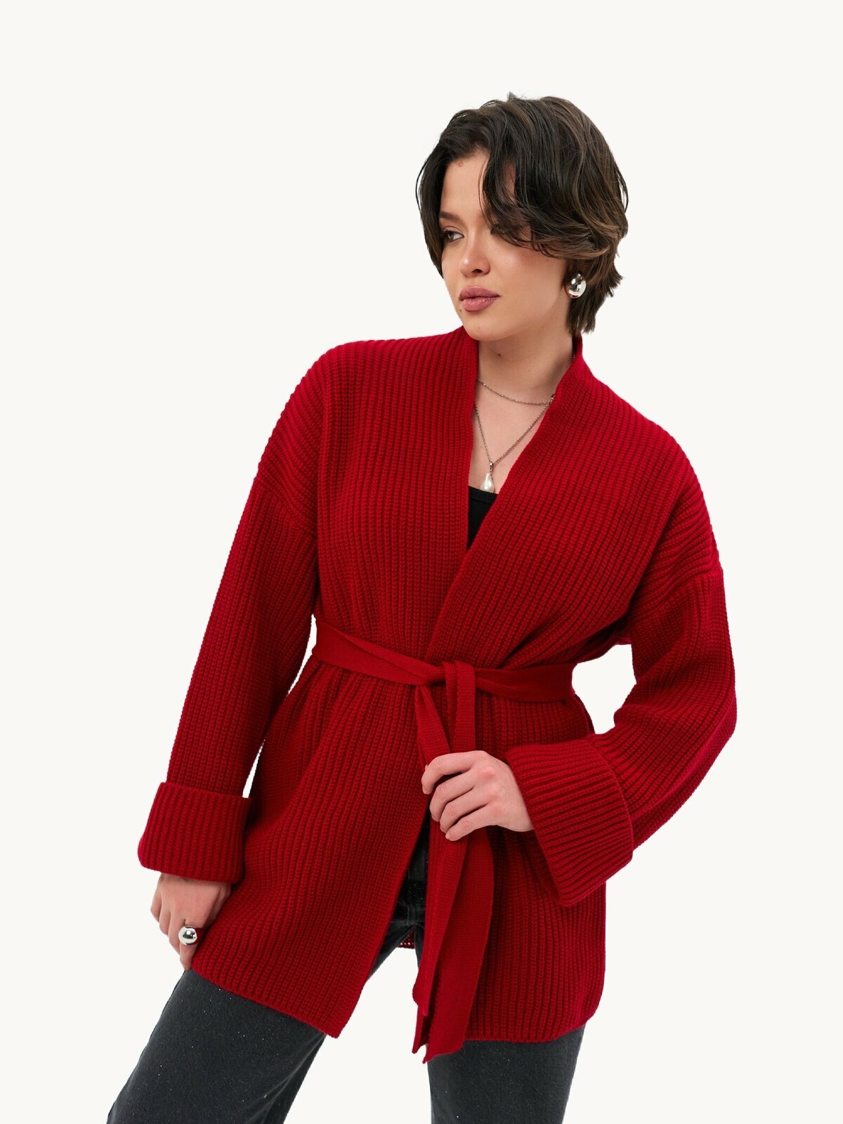 Кардиган Daffy World: стиль и комфорт для женщин. Кардиган Daffy World – стильный и комфортный выбор для женщин. Выполненный в ярком красном цвете, он станет отличным дополнением к вашему гардеробу и подчеркнет вашу индивидуальность. Оверсайз силуэт и удлиненный крой. Кардиган имеет свободный и просторный силуэт оверсайз, который обеспечивает максимальный комфорт и свободу движений. Удлиненный крой позволяет носить его как с брюками, так и с юбками, создавая разнообразные образы. Материал и состав. Кардиган изготовлен из вязаного трикотажа, состоящего на 100% из акрила. Этот материал обладает высокой износостойкостью, сохраняет тепло и приятен на ощупь. Кардиган Daffy World имеет ряд особенностей, которые делают его уникальным и привлекательным. Воротник отсутствует, что придает модели современный и актуальный вид. Длинные рукава и пояс на застежке обеспечивают дополнительную защиту от холода. Отсутствие карманов делает модель более лаконичной и стильной. Кардиган подходит для беременных женщин, обеспечивая комфорт и тепло в течение всего периода вынашивания ребенка. Выбирая кардиган Daffy World, вы получаете стильный, комфортный и качественный элемент гардероба, который станет вашим любимым предметом одежды.