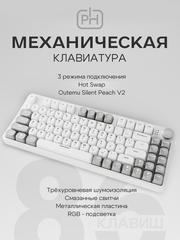 Cidoo QK61 V2 представляет собой компактную механическую клавиатуру с 60% раскладкой, идеально подходящую для мобильного использования. Устройство оснащено тремя режимами подключения: проводным, беспроводным 2.4GHz и Bluetooth, что обеспечивает максимальную гибкость использования. Встроенный аккумулятор ёмкостью 3000 мАч гарантирует длительное время автономной работы, а переключатель режимов расположен рядом с USB-портом для удобства пользователя. Дизайн Эргономика и комфорт являются ключевыми особенностями QK61 V2. Конструкция с поликарбонатной пластиной и гасящей структурой обеспечивает приятный тактильный отклик при наборе текста. Пять слоёв звукопоглощающих материалов, включая сэндвич-пену, PET-пленку, IXPE-подкладку и силиконовые прокладки, создают характерный thocky-poppy звук при печати. Южная подсветка (south-facing LEDs) обеспечивает равномерное освещение через дно кейкапов, а продуманная конструкция стабилизаторов делает длительные сеансы печати комфортными и не утомляющими. Функциональность Технические характеристики клавиатуры впечатляют своим функционалом. Модель оснащена горячей заменой переключателей (hot-swappable PCB), совместимой с 3-pin и 5-pin механическими переключателями, включая Cherry, Gateron, Kailh и другие. В стандартной комплектации установлены линейные переключатели CIDOO Pearl White с усилием срабатывания 40г. Клавиатура комплектуется PBT-кейкапами с профилем Cherry, изготовленными по технологии двойного литья, а также двумя прозрачными PC-кейкапами для стильного внешнего вида. Особенности: