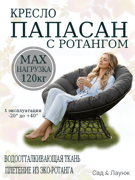 Прочный стальной каркас с антикоррозийным покрытием выдерживает до 120 кг. ◦ Плетение из искусственного ротанга устойчиво к влаге, ультрафиолету и перепадам температур - не гниёт, не трескается, не выцветает. ◦ Подушка для кресла Папасан выполнена из ткани «Oxford 600D PU» с полиуретановой пропиткой: водоотталкивающая и антивандальная, устойчивая к выцветанию. ◦ Конструкция не гниёт, не привлекает насекомых, не выцветает со временем.