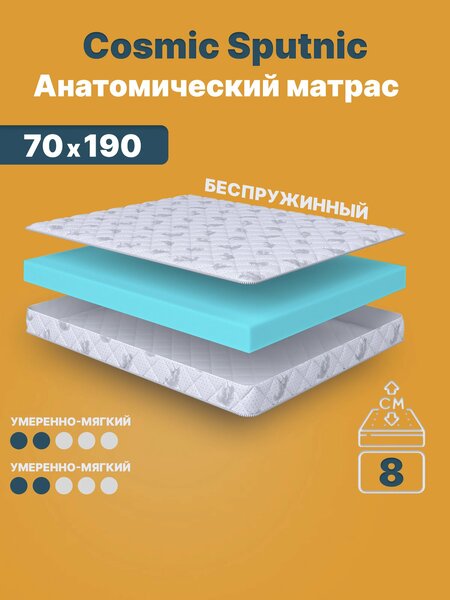 Ортопедический матрас "Cosmic Sputnic" 70х190 — удобное и надёжное решение для односпальной кровати. Беспружинная конструкция из гипоаллергенного материала AirFoam обеспечивает анатомическую поддержку позвоночника и равномерное распределение нагрузки. Высота матраса — 8 см, умеренно мягкой жесткости с обеих сторон делает его комфортным для большинства пользователей. Чехол из прочного жаккарда защищает от износа и продлевает срок службы изделия. Этот односпальный матрас 70х190 легко разместить на любом основании кровати. Он поставляется в рулоне в вакуумной упаковке, что облегчает транспортировку и хранение. Подходит для взрослых и детей, обеспечивает правильное положение тела и здоровый сон. Матрасы Cosmic Mercury относятся к категории «беспружинный матрас», сочетают долговечность, экологичные материалы и удобство, что делает их оптимальным выбором для повседневного использования.