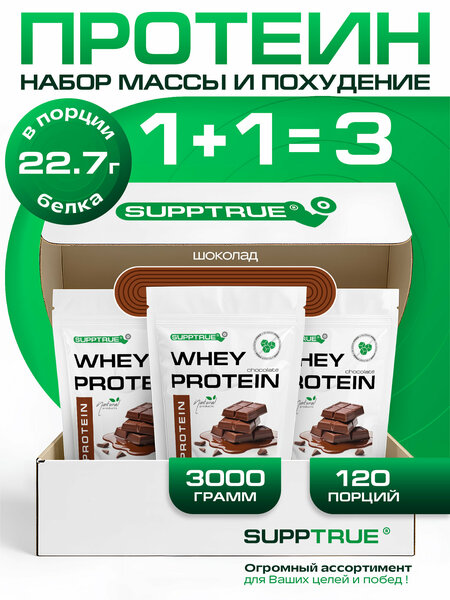 Протеин сывороточный Supptrue: набор протеинов "Шоколад " 3 штуки / 3000г 120 порций Протеин сывороточный изолят Supptrue порошок - это белковый протеиновый коктейль, изготовленный из европейского сырья с использованием натуральных ароматизаторов из Германии. Подходит для мужчин и женщин и поможет вам в достижении поставленных целей. Изолят сывороточного белка содержит в себе белок протеиновый в количестве 22,5 грамма на порцию. Это позволяет приготовить насыщенный полезными веществами белковый напиток без сахара. Выпускается в виде 1 кг или 500г порошка без вкуса или со вкусом шоколада, клубники, банана и т. д. Так что любой, даже самый изощренный протеиновый сомелье найдет напиток по вкусу. Упаковка: мягкая упаковка Дополнительная информация: При температуре до +25`C Форма выпуска: порошок Диетические особенности: без ГМО, без глютена, без сахара Прочие характеристики: Белок: грамм в 1 порции: 22.5, Жиры: грамм в 1 порции: 0.25, Углеводы: грамм в 1 порции: 0.75, Энергетическая ценность: ккал в 1