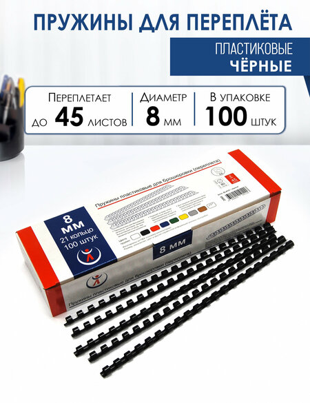 Основные характеристики: Диаметр - 8мм; Цвет – черный; Переплет – до 45 листов бумаги 80гр/м2; 100 штук в коробке; 21 кольцо; Материал ПВХ пластик (ПолиВинилХлорид); Пружины пластиковые диаметр 12 мм, черный, для переплета или брошюровки - предназначены для быстрого и удобного переплета документов, каталогов, дипломов и другой печатной продукции при помощи переплетной машины. Пластиковые пружины можно использовать для переплета бумаги формата А4 или А3 (по короткой стороне), а если документ меньшего размера, то пружину можно обрезать. Можно использовать пластиковые пружины и дома, сшивая, к примеру: тематические подборки рисунков или раскрасок, контурных карт, стихов, схем и даже заламинированных листьев деревьев! Переплет пластиковыми пружинами позволяет, разжав пружину, добавить или удалить листы в документ. Эти пружины подходят ко всем типам переплетных машин и брошюровальных аппаратов на пластиковую пружину. Для придания законченного вида вашей брошюре рекомендуется использовать картонные и пластиковые обложки для переплета.