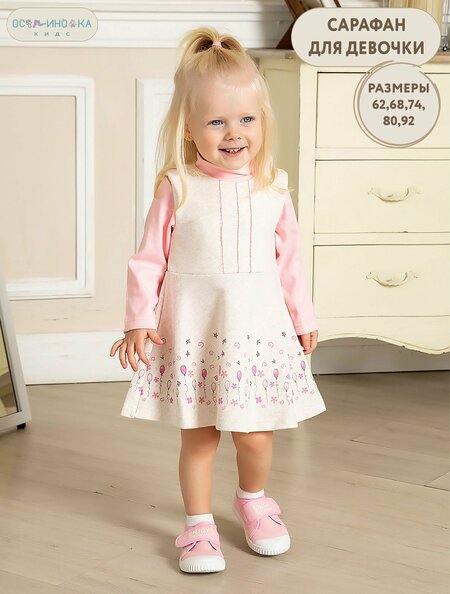Теплый сарафанчик из коллекции "Маусвиль" из трикотажного полотна футер (100% хлопок). Мягкий, теплый, с веселым печатным рисунком. Верхняя часть- полочка на подкладе кулир (100% хлопок). Всесезонный. Подходит и для повседневной носки, и как нарядная одежда. Цвет: бежевый. Размер: 62,68,74,80,86,92. Оттенки оригинального изделия могут несущественнно отличаться от фотографии!