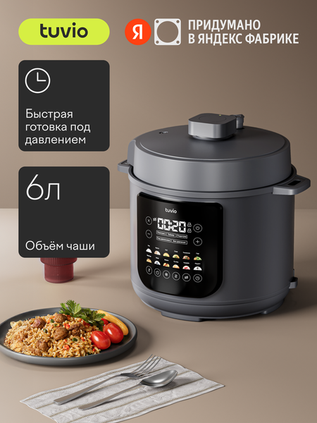 Tuvio — это бренд удобной бытовой техники, придуманный в Яндекс Фабрике. TMPC03D6 — это мультиварка-скороварка с 12 автоматическими программами. Подойдёт и тем, кто готовит каждый день, и тем, кто только учится. Все программы разработаны поварами и точно настроены — получится приготовить мясо, птицу, чизкейк и другие блюда. Для своих рецептов есть ручной режим: легко задать время и температуру, а найти идеи поможет книга рецептов — она идёт в комплекте. С мощностью 1000 Вт чаша нагревается быстро, а мультиварка поддерживает нужную температуру на всех этапах готовки. Герметичная крышка создаёт внутри скороварки давление — благодаря этому мясо, крупы и другие продукты готовятся намного быстрее. Объёма чаши — 6 литров — хватит, чтобы приготовить блюдо для всей семьи. Двухслойное антипригарное покрытие не выделяет вредных веществ при нагреве. Стенки равномерно распределяют тепло, поэтому блюда прогреваются до полной готовности. Чашу можно мыть вручную или в посудомоечной машине. Цветные индикаторы на экране покажут все этапы приготовления. Устройство продуманное и безопасное: звуковые сигналы можно отключить, а панель управления — заблокировать от случайных нажатий. Внутреннюю крышку, паровые клапаны и контейнер для конденсата просто снять, чтобы помыть.
