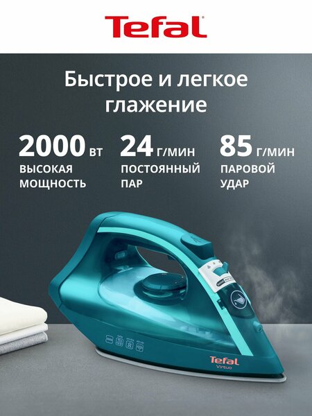 Паровой утюг Tefal Virtuo FV1712E0 – ваш надежный помощник в борьбе со складками. С максимальной мощностью 2000 Вт этот утюг для дома быстро нагревается, позволяя вам незамедлительно приступить к глажению. Постоянный пар до 24 г/мин обеспечивает эффективное разглаживание складок, а функция парового удара в 85 г/мин делает вертикальное отпаривание простым и удобным – идеальный выбор для пиджаков, платьев и деликатных вещей. Одной из ключевых особенностей бытовой техники тефаль является противокапельная система, которая защищает ткань от пятен и разводов, гарантируя, что ваша одежда останется в идеальном состоянии. Система против накипи упрощает очистку утюга, продлевая срок его службы и поддерживая стабильную подачу пара. Подошва с антипригарным покрытием разработана по специальной технологии, что обеспечивает легкое скольжение по ткани и защищает одежду от повреждений. Дополнительно, система «Капля-стоп» предотвращает стекание воды с подошвы, сохраняя вещи сухими и чистыми даже при глажении на низких температурах. С паровым утюгом Tefal Virtuo вы сможете легко и быстро привести свои вещи в порядок, избавляясь от складок и придавая им безупречный вид!