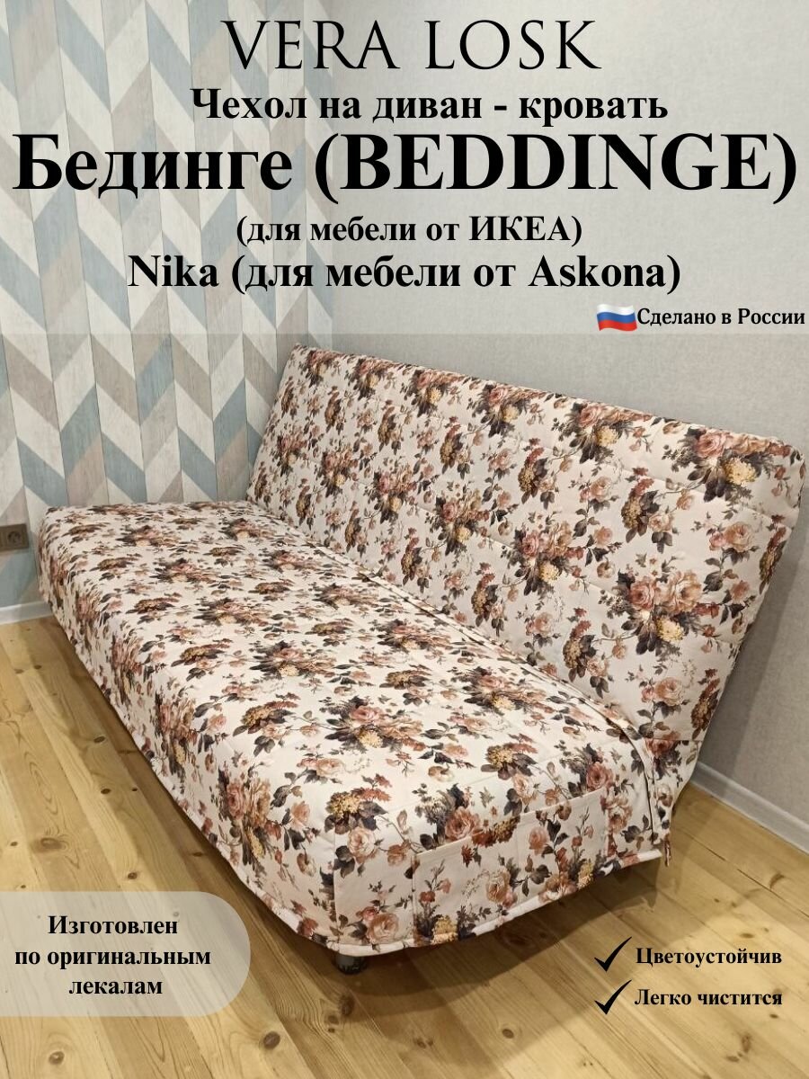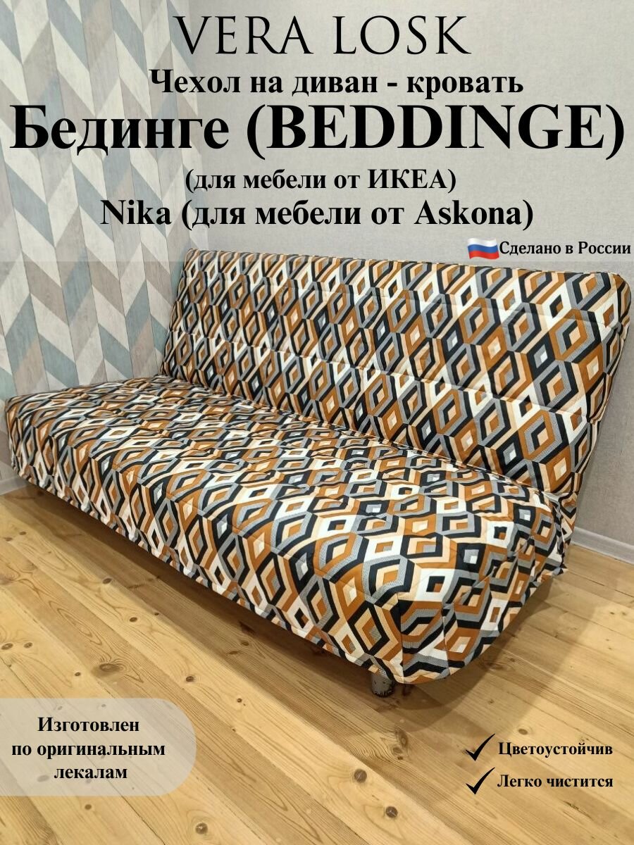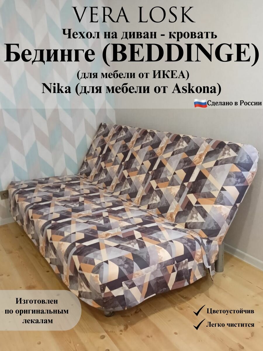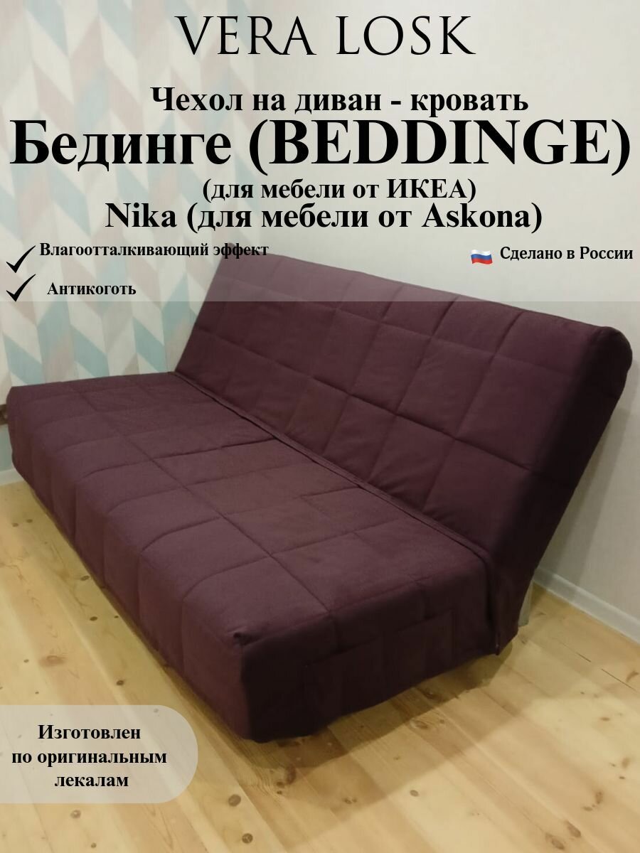Чехол Бединге (BEDDINGE). Чехол стеганный на диван-кровать Бединге (BEDDINGE) от компании Vera Losk изготовлен по оригинальным лекалам, идеально подходит для диванов Бединге (BEDDINGE) от икеа, NIKA от Askona. Размер спального места 200*140 см. Матрас дивана Бединге (BEDDINGE) от икеа, NIKA от Askona состоит из двух не равных частей 80 см сиденье и 60 см спинка, размер чехла 71 см и 69 см указан для дивана в собранном виде, так как матрас спинки (в сложенном виде дивана) стоит на матрасе сиденье, в связи с чем, матрас сиденья (глубина сиденья) сокращается на ширину матраса спинки (высоты спинки), а высота спинки увеличивается на ширину сиденья, на котором она стоит. Диван раскладывается в чехле. Состав чехла для дивана - 100% полиэстер. Специализированная мебельная ткань, используемая при изготовлении чехла - не резиновая, не тянется, не меняют форму при эксплуатации. Чехол для дивана-кровати трехслойный: основная ткань - износостойкая мебельная ткань рогожка мелкого плетения «Vesta»; синтепон - 200 г/м. кв; техническая (подкладочная) ткань – спанбонд. Чехол для мебели состоит из двух частей: спинка и сиденье, объединенных разъемной молнией, что облегчит дальнейшую стирку и глажку. Спинка дивана полностью закрывается чехлом. На чехле для мебели по бокам расположены наружные карманы, в которых можно хранить пульт, телефон и другие необходимые мелкие предметы, а также внутренние потайные карманы. Чехол следует надевать на диван в сложенном виде (матрас спинки дивана стоит на матрасе сиденья) начиная со спинки дивана, после чего, опустить его на сиденье и расправить, при этом молния должна быть застегнута! Ультрамодные цвета чехла подойдут для любого стиля и дизайна интерьера, дополнят и обновят его. Оттенок может отличаться от фото при разном освещении, а также в связи с разной цветопередачей цифровых устройств. Уход за чехлами для мягкой мебели предполагает ручную и машинную стирку до 40 С°, со средствами для деликатной стирки, без отжима. Не сушить в стиральной машине! Глажка только в режиме синтетики. Чехол упакован под прессом, после распаковки набирает объем не менее 48 часов.